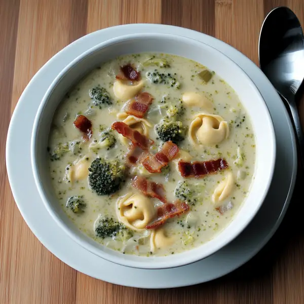 Ultimate Cheesy Broccoli Soup with Bacon & Tortellini
