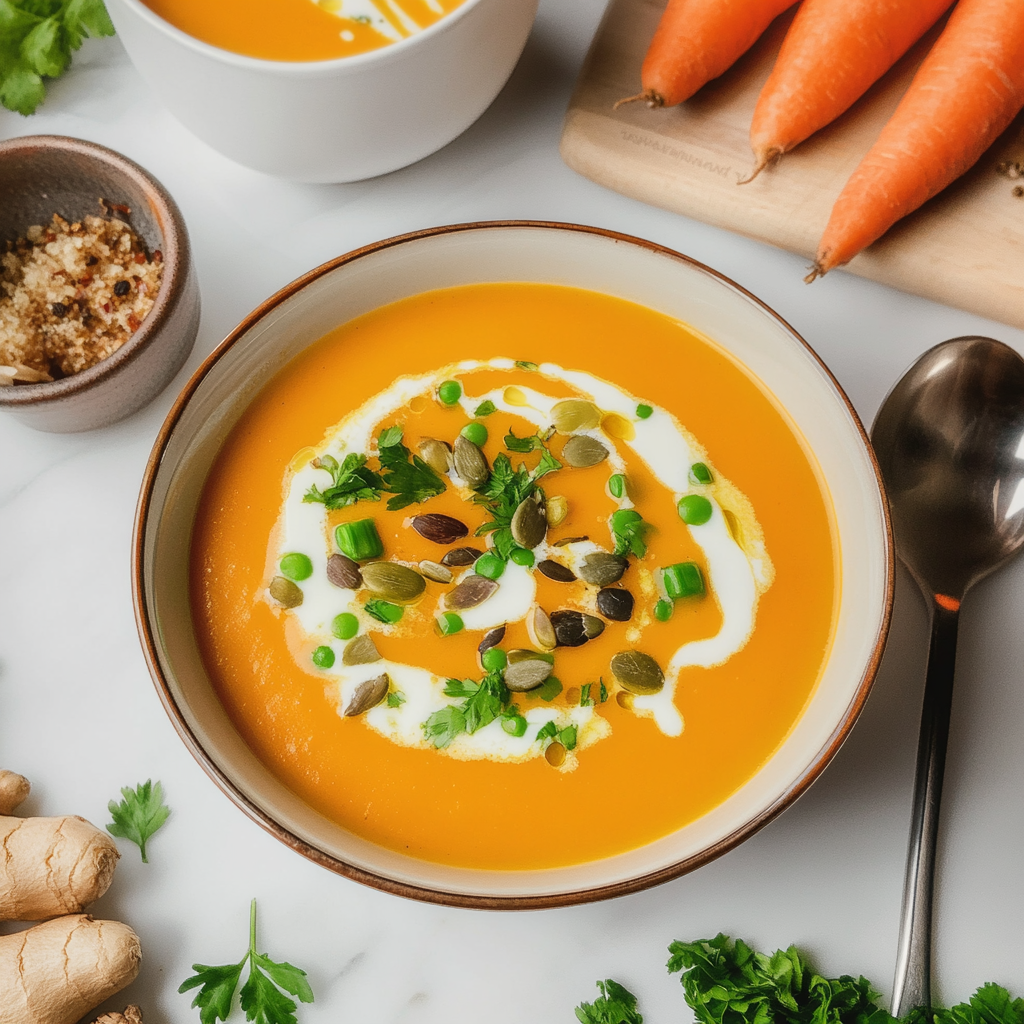 Start by sautéing onions and garlic until fragrant, then add carrots and ginger. Pour in vegetable broth, simmer until tender, and blend for a creamy texture.
