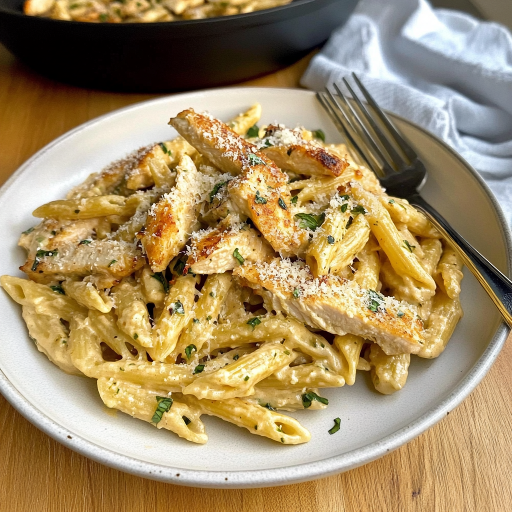 Add Cheese and Combine Ingredients: Stir in freshly grated Parmesan cheese until melted and creamy. Toss in the cooked pasta along with sliced chicken pieces, mixing everything until coated beautifully.