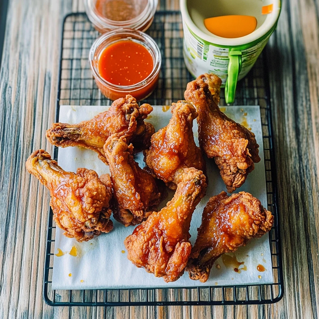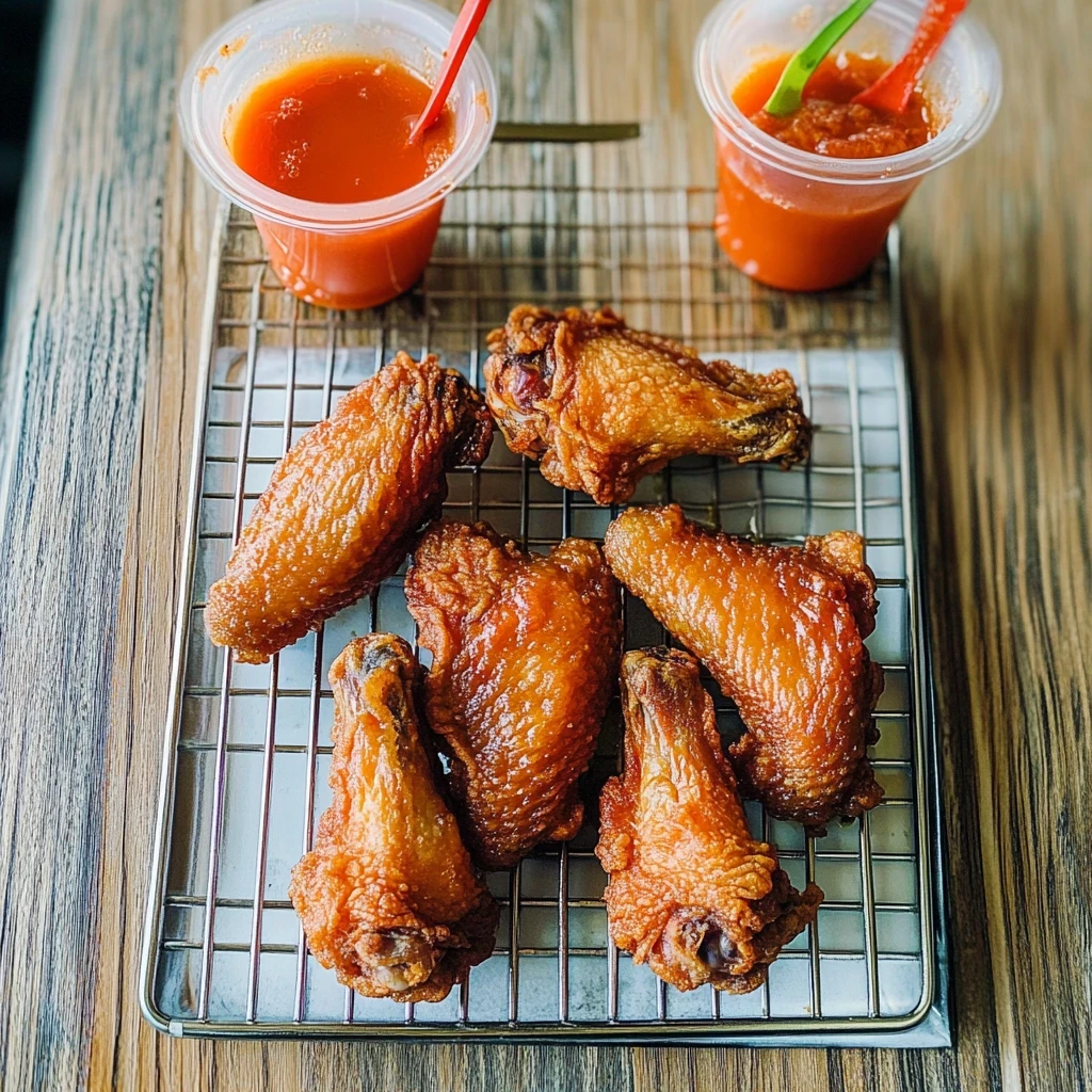 Fry the Chicken Wings: Now it’s time for the fun part! Heat up about 4 cups of vegetable oil in a deep fryer or heavy pot until it reaches a temperature of 350°F (175°C). Use a thermometer for accuracy; this will ensure your wings fry perfectly! Remove the chicken wings from the marinade and let any excess drip off. Dredge each wing thoroughly in your flour mixture—this step is crucial for that golden-brown crispiness. Carefully place the wings into the hot oil in small batches; overcrowding can lead to uneven cooking. Fry them for about 8-10 minutes or until they reach that beautiful golden-brown color and an internal temperature of at least 165°F (74°C). Using a slotted spoon, remove the wings from the oil and allow them to drain on paper towels.