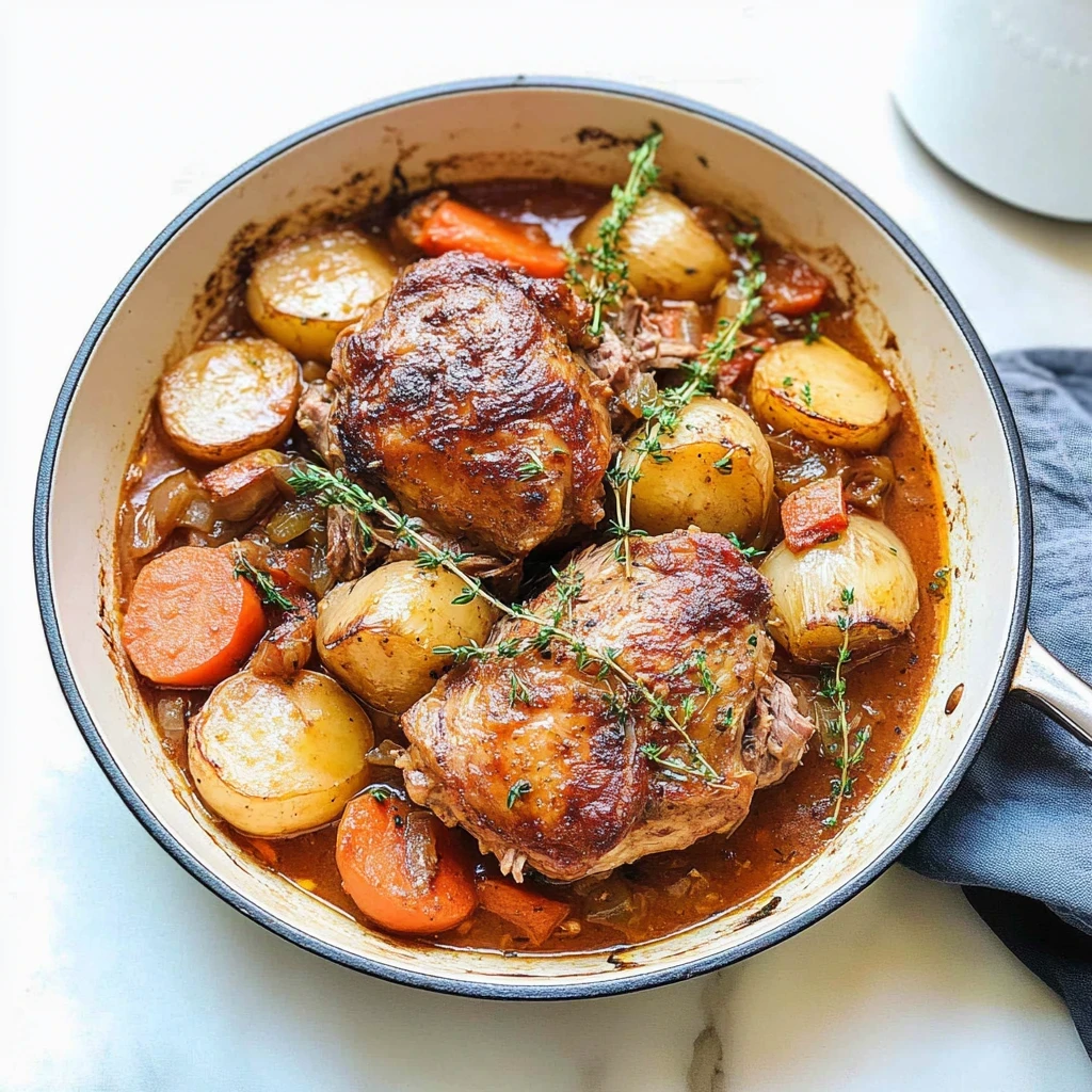 Begin by preheating your oven to 350°F (175°C). Heat olive oil in a Dutch oven over medium-high heat. Season the chicken pieces with salt and pepper before browning them in the hot oil for about 5-7 minutes on each side. Once browned, remove the chicken and set it aside. In the same pot, add chopped onions and minced garlic; sauté until softened for about 3-4 minutes. Next, add sliced carrots, celery, and cubed potatoes to the pot while stirring for another 5 minutes. Pour in the low sodium chicken broth and add thyme and rosemary; stir well to combine. Return the browned chicken to the pot, nestling it among the vegetables.