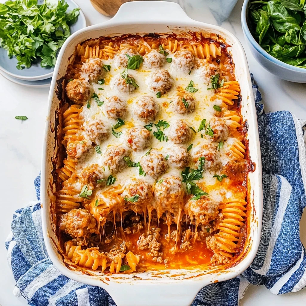 Preparation: Start your culinary adventure by preheating the oven to a cozy 375°F (190°C). This will create the perfect environment for your dump and bake meatball casserole. While the oven warms up, grab a large mixing bowl and add in 1 pound of frozen meatballs, whether you prefer beef or turkey. The moment you open that bag, you’ll be greeted with a hearty aroma that promises warmth. Next, pour in 2 cups of marinara sauce; the rich red color will brighten your dish instantly. Toss in 1 cup of uncooked pasta—penne or rotini works wonderfully here—along with 1 cup of water to help cook the pasta as it bakes. Don’t forget to sprinkle in those essential seasonings: 1 teaspoon each of Italian seasoning, garlic powder, onion powder, salt, and black pepper. Mix everything together until well combined; you want to see those vibrant colors mingle beautifully. Now, transfer this delightful mixture into a greased 9×13 inch baking dish, making sure it’s evenly spread out so every bite is as delicious as the last.