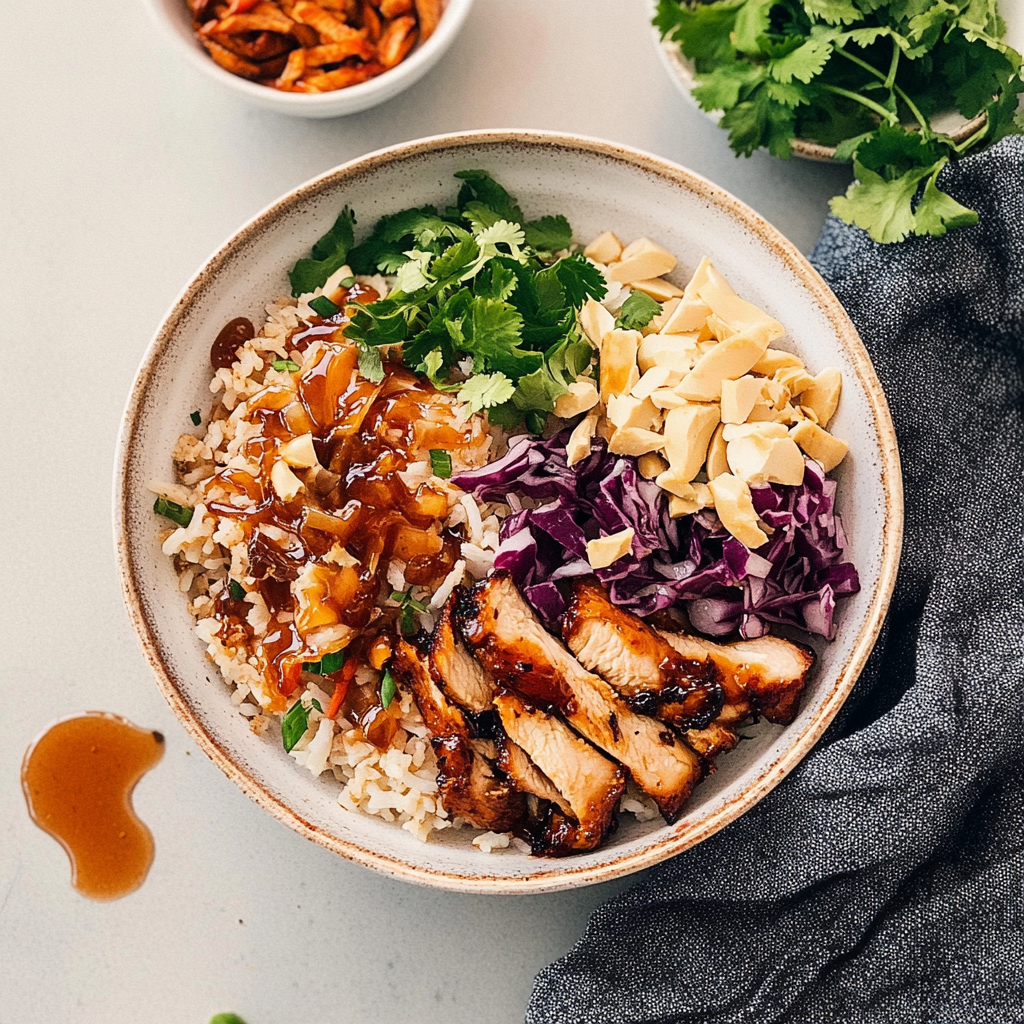 Assemble your bowls by placing a generous scoop of rice or quinoa at the bottom. Top it off with those beautiful veggies and sliced chicken drizzled with extra hot honey for good measure.