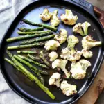 - Preheat the oven to 425°F (220°C). On a baking sheet, toss the cauliflower and asparagus with olive oil, salt, and pepper. Roast for about 25 minutes until golden brown.