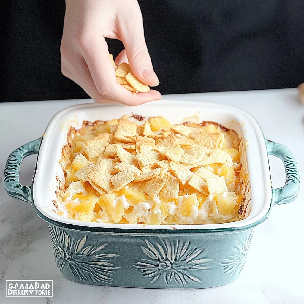 Assemble the Casserole: Pour the pineapple mixture into a greased baking dish, spreading it evenly. Next, sprinkle your buttery Ritz cracker topping generously over the pineapple layer. It should create a lovely golden crown for your casserole.